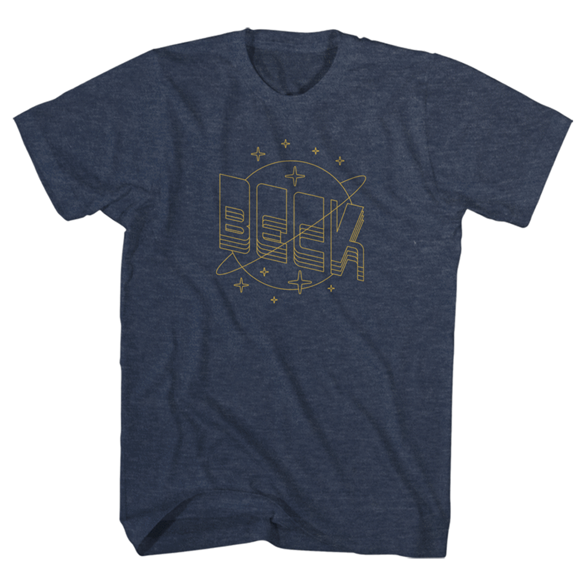 Stars Above design printed on a heather navy, 50% cotton, 50% polyester, unisex tee.